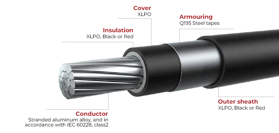 Livre de halogênio. Cabo de baixa tensão resistente a UV. O cabo de alumínio TÜV2642 é especialmente adequado para aplicações externas e enterramento diretamente no solo.