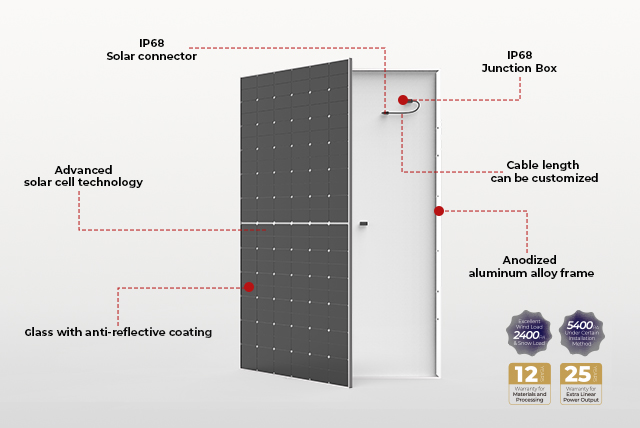 Os painéis solares SUNKEAN têm maior eficiência de conversão de módulo, menor custo por quilowatt-hora, excelente desempenho anti-PID, passaram na certificação de tolerância à névoa salina e resistência à amônia e passaram na certificação de carga de vento 2400Pa e carga de neve 5400Pa. Os painéis solares e conectores são duráveis e à prova d'água. A estrutura em liga de alumínio anodizado é durável e pode suportar os efeitos de furacões, chuva, neve e muito mais.
