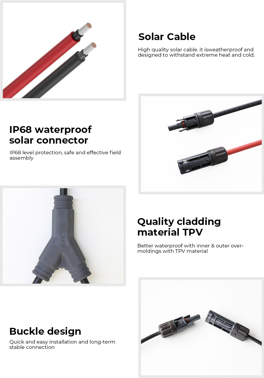 O chicote de ramificação SUNKEAN Y tem classificação IP68 à prova de água e pode ser usado em uma ampla faixa de temperatura operacional de -40 °C a 90 °C. Menor resistência de contato e maior capacidade de transferência de corrente garantem alta eficiência do produto.