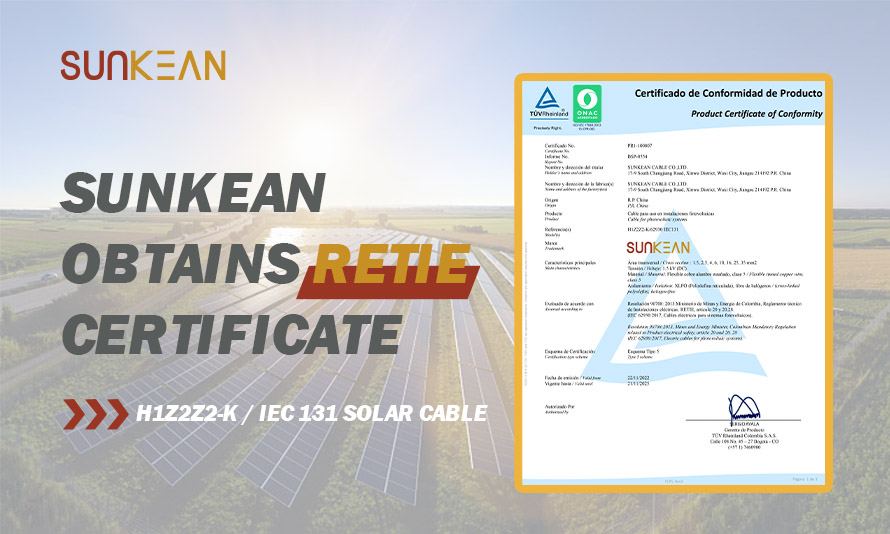 A SUNKEAN anuncia hoje que a empresa obteve a certificação RETIE da Colômbia para seus tipos de cabo solar H1Z2Z2-K/62930 IEC131. Este certificado inclui cabos solares IEC131 de 1,5 a 35 mm 2 H1Z2Z2-K/62930.
