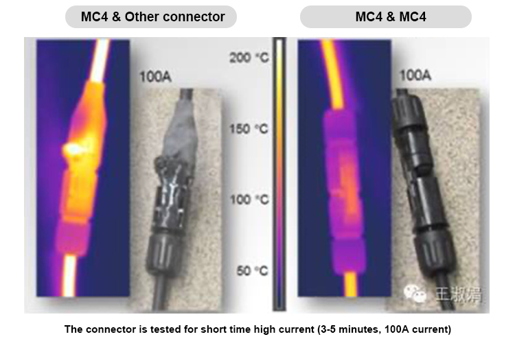 uma investigação conjunta por fraunhofer ISE e TUV encontrou uma alta probabilidade de incêndios causados por conectores. a razão fundamental para o incêndio do conector é que a resistência do conector aumenta sob a condição de fluxo de corrente, o que aumenta a temperatura aumentar e exceder a faixa de temperatura que o invólucro de plástico e as peças de metal podem suportar, causando um incêndio. portanto, a falha do conector e a causa do incêndio são o resultado da ação combinada do plástico concha e as partes metálicas.