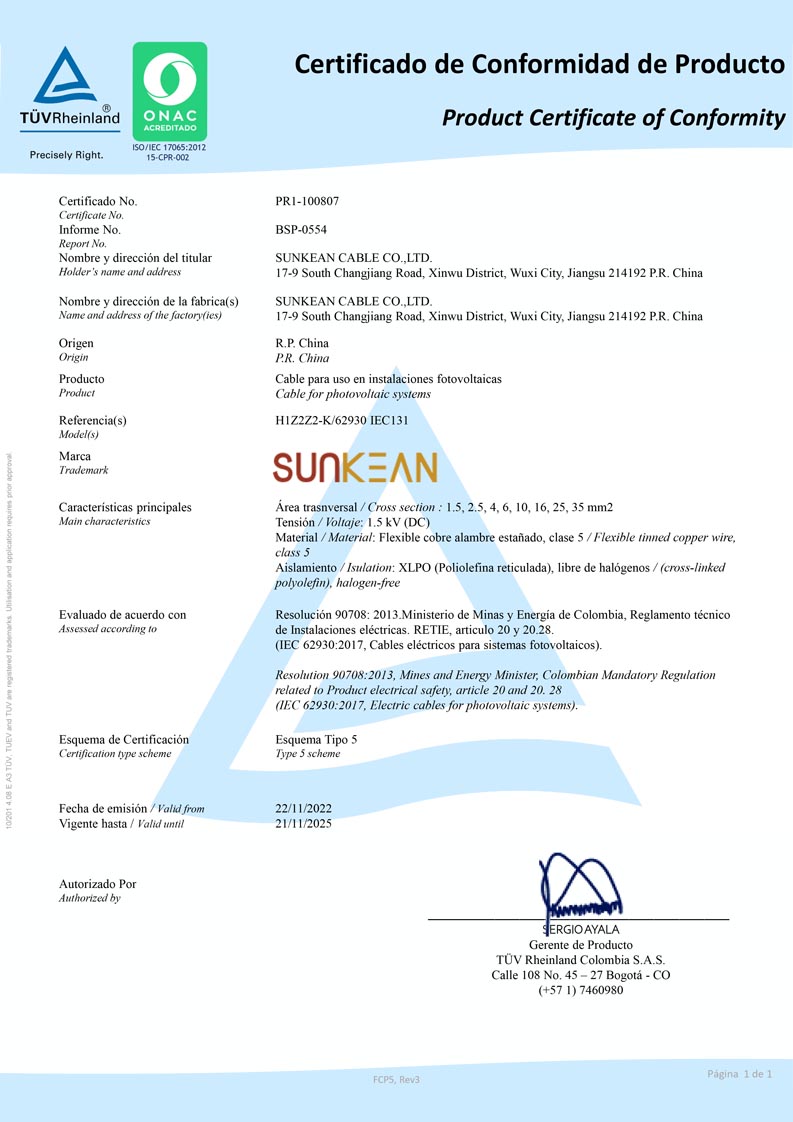 A aquisição do certificado RETIE oferece uma forte garantia para os cabos fotovoltaicos SUNKEAN H1Z2Z2-K/62930 IEC131 entrarem no mercado colombiano.