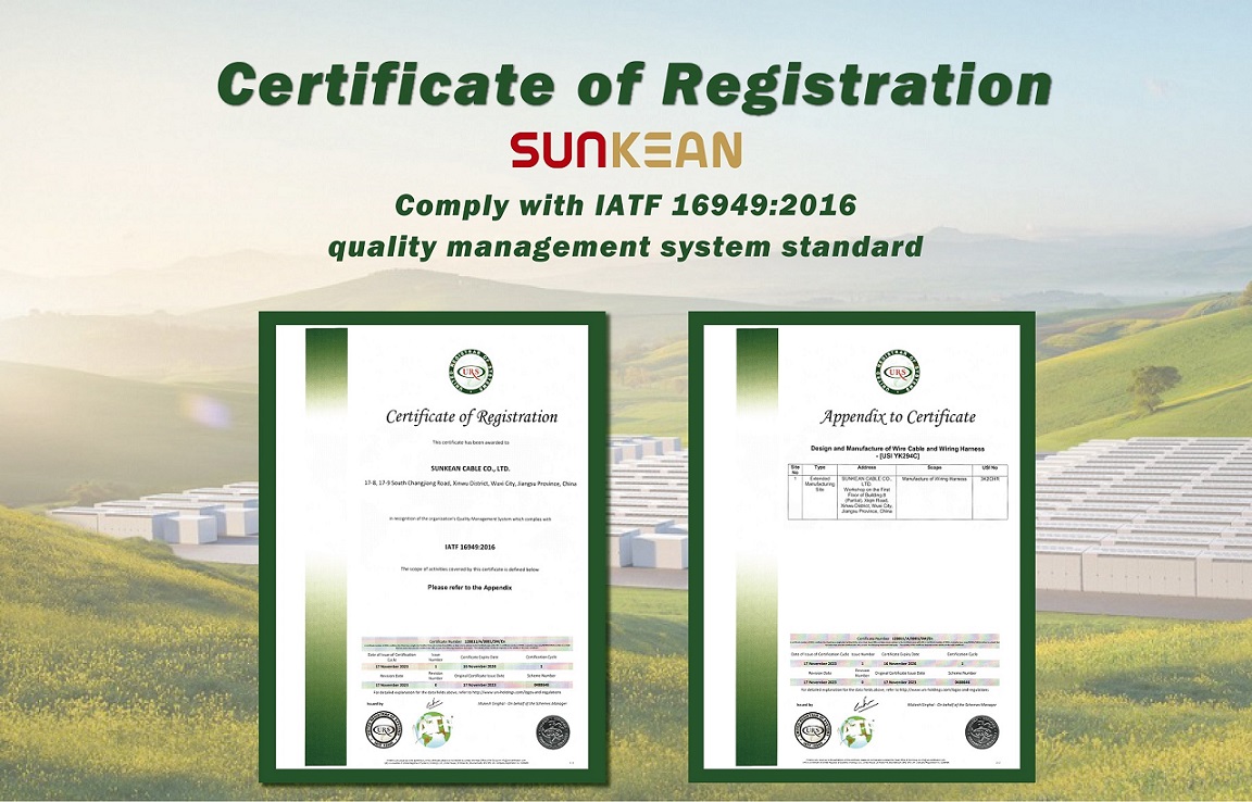 A certificação IATF16949 é um padrão de sistema de gestão de qualidade desenvolvido pela International Automotive Task Force (IATF) e representa o mais alto padrão de qualidade na indústria automotiva em todo o mundo. Pouco depois de ganhar a primeira nova versão do certificado de cabo de armazenamento de energia TUV Rheinland, a SUNKEAN ganhou a certificação IATF16949 e ficou sem a certificação " ;Velocidade SUNKEAN" novamente.