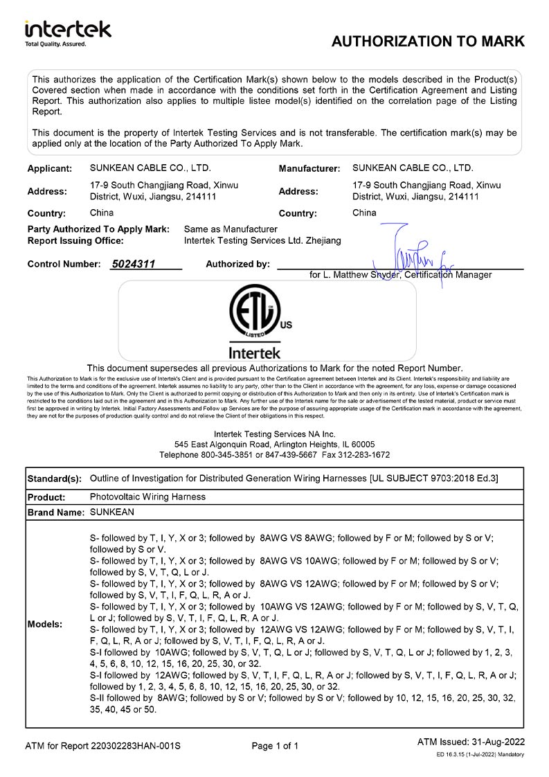 Recentemente, os produtos de cablagem fotovoltaica da SUNKEAN passaram com sucesso no teste do Intertek Intertek Group e concluíram o processo de certificação e receberam o certificado Intertek ETL. A aquisição do certificado ETL fornecerá um certificado de qualidade de produto de terceiros confiável para os produtos SUNKEAN Photovoltaic Wiring Chiring para entrar no mercado norte-americano, tornando mais fácil para os compradores aceitarem os dados de qualidade do produto.
