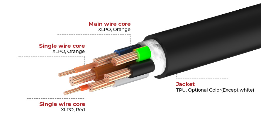 XLPO Núcleo principal: Azul, marrom, preto, cinza, amarelo e verde Núcleo de fio único: laranja, vermelho |