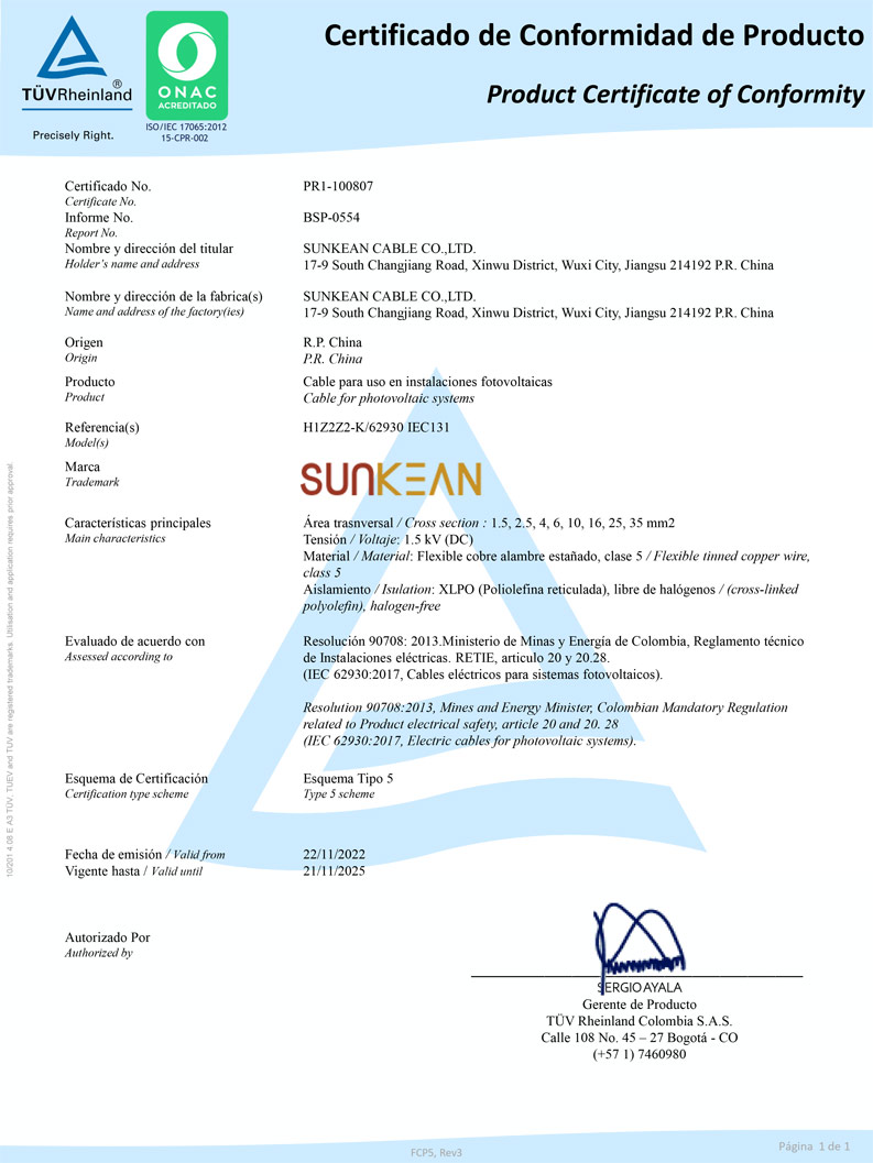Certificado de Cabo Solar RETIE