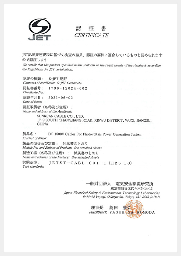 Certificado de Cabo Solar S-JET PV-CQ