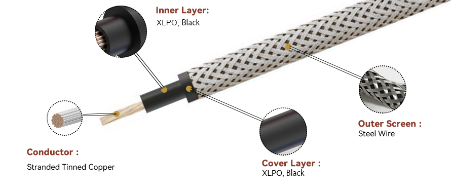 Esta trança de blindagem de aço inoxidável 1500V H1Z2Z2-K é adequada para a interligação dos componentes de sistemas fotovoltaicos e é caracterizada por: ótimas propriedades mecânicas em uma faixa de temperatura operacional - 40 a + 90 ° C, alta resistência à abrasão, rasgo, UV, ozônio , água, propagação de chamas, baixa emissão de fumaça, livre de halogênio, resistência às intempéries que permite um período igual à vida útil do sistema fotovoltaico. Além disso, fornecem proteção adequada contra roedores e cupins.