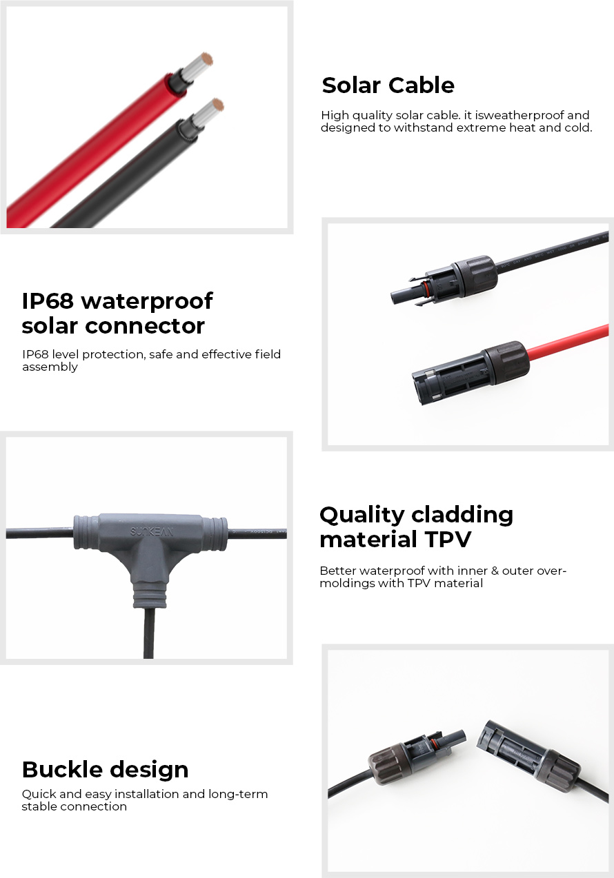 O chicote de ramificação SUNKEAN T tem classificação IP68 à prova de água e pode ser usado em uma ampla faixa de temperatura operacional de -40 °C a +90 °C. Menor resistência de contato e maior capacidade de transferência de corrente garantem alta eficiência do produto.